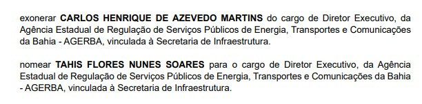 Êta. O governador Jerônimo Rodrigues (PT) exonerou o diretor da Agência Estadual de Regulação de Serviços Públicos de Energia, Transportes e Comunicações da Bahia (AGERBA), Carlos Henrique de Azevedo Martins, irmão do senador Angelo Coronel. A informação foi publicada no Diário Oficial desta quarta-feira, dia 25/3.