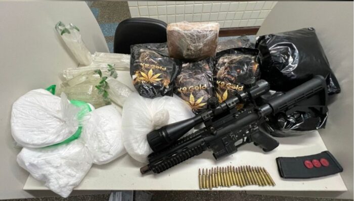 Os policiais realizaram buscas e localizaram o suspeito. Na abordagem, encontraram com ele um fuzil 5.56 com luneta, um carregador e 24 munições, 12 kg de maconha k9, 21 frascos de lança perfume, um tablete de maconha e seis quilos de cocaína.